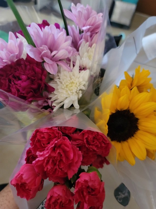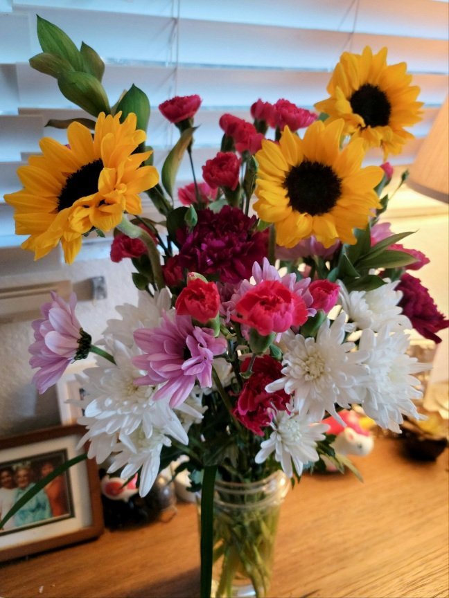 I just spent 30min talking to the flowers in Safeway. Okay, okay maybe it was more to myself and a lil bit them. I walked into the produce area and this colorful bouquet caught my eye. I had to go look. Sooooo many pretty flowers, colors, textures!! I don't normally do cut flowers, but I neeeeeded them and instantly became my lil self. The flower lady prob thought I was crazy. Picking up this one and that telling them they're too small, big or not the right color.. but not to worry they are still very beautiful as I put them back and patted their cellophane wrappers for comfort. Standing before the pretty yellow sunflowers bouncing on my toes, worrying over the price. But they'd be perfect pops of color and they make me smile. Do I need them or don't I ?? *bounce bounce* YES!! Smiling like a crazy person as I pick out just the right ones. Get them home... I don't own a vase. Ooops. Closest thing is the pitcher to my blender. It'll work. π€