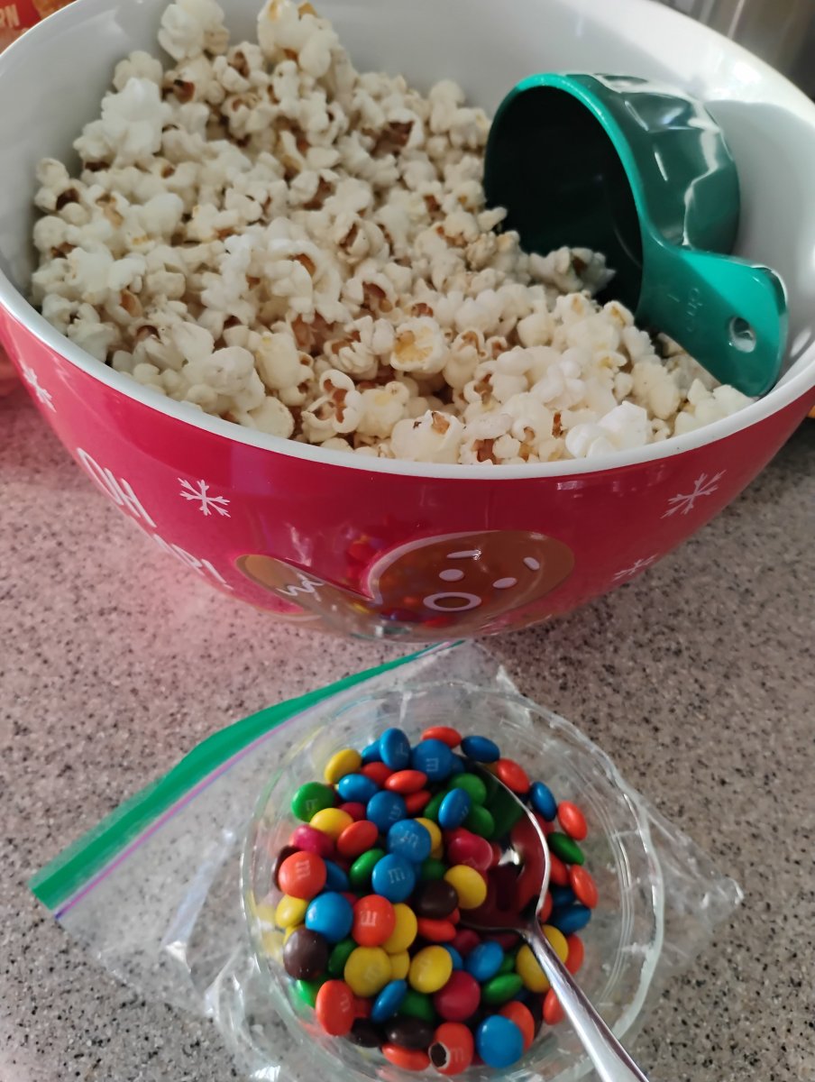 Butter popcorn made on the stovetop with some M&Ms candies π