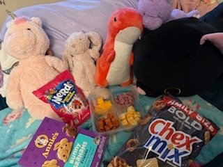 This is my stuffie picnic. My Care Bear, named, Care Bear and my blue Alien, named Zarina are 2 of my favorites this week, so they joined me for a picnic, snack... I gave them each a Girl Scout Cookie and I got some sweet potato puffs! (Kinda pushing the line on too much sugar with the puffs, but one or two should be ok...๐ฅฐ). The stuffie had pretend drinks coz I let them sit on my favoritest Hello Kitty blanky... I had water... coz it's all I can have...6 points