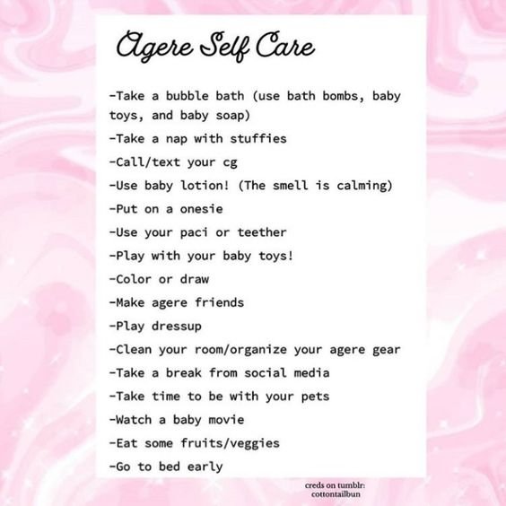 - little-ify daily task! make chores into a game, have a sticker chart or rewards, use your little gear during it like diapers or pacis or stuffie friends, let yourself regress while doing it if you can do so safely, listen to little music, and so on!