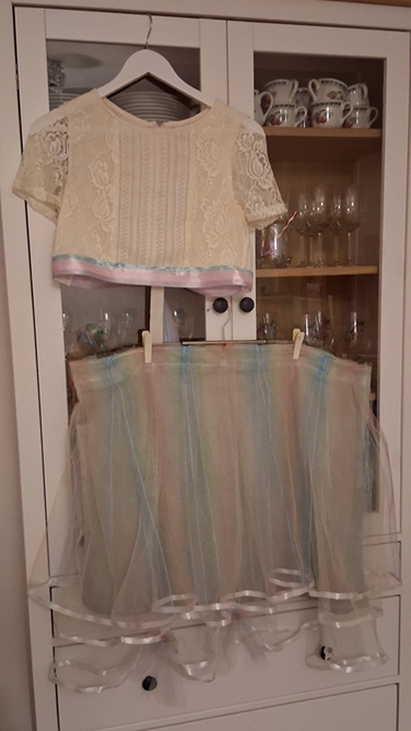 Since I can't find any pretty princess dresses in my size, I decided to make my own. I'm doing it by cutting apart och sewing together two dresses, and adding a bit of rainbow tulle. ☺️